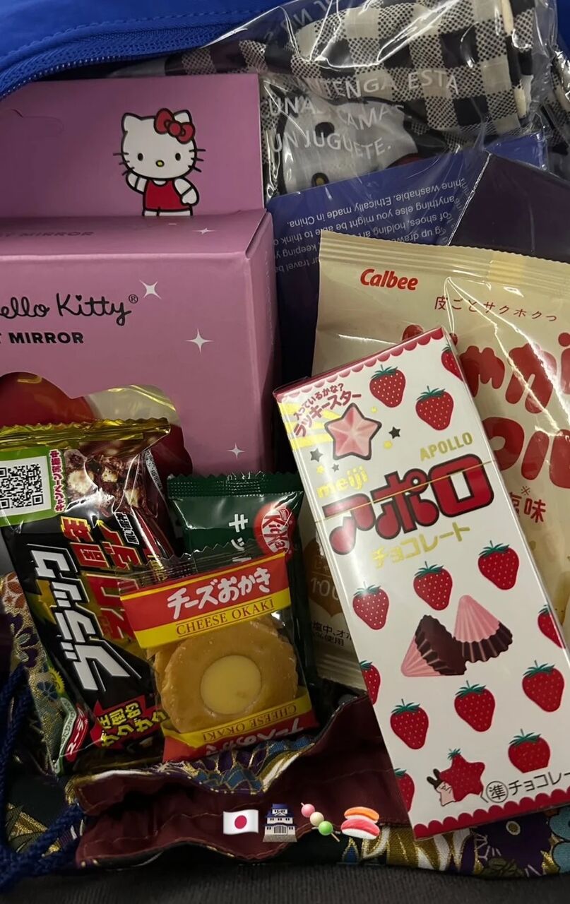 ニコルさんの投稿には「アポロ」「チーズおかき」「ブラックサンダー」「キットカット」「じゃがポックル」といった日本のお菓子のほか、ハローキティのグッズの写真も添えられた。