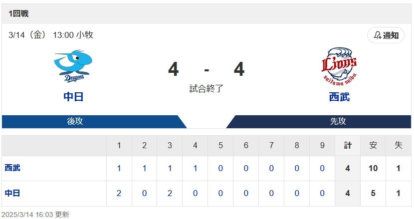【中日対西武オープン戦】中日が西武とドロー…二転三転 上林の2戦連発2ランで逆転 さらに石川昂がOP1号2ランで再度、勝ち越すも仲地は4回6安打4失点