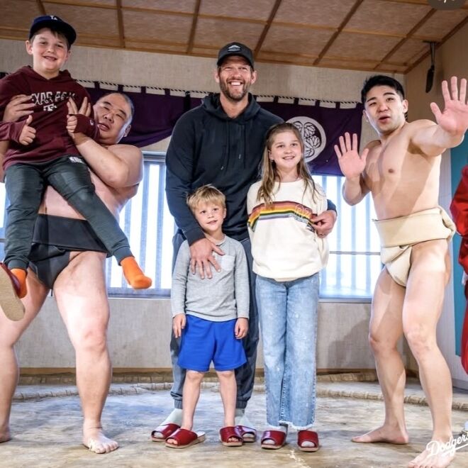 力士たちと並んで満面の笑みを浮かべるカーショウ一家(画像はドジャース公式インスタグラムのスクリーンショット)。