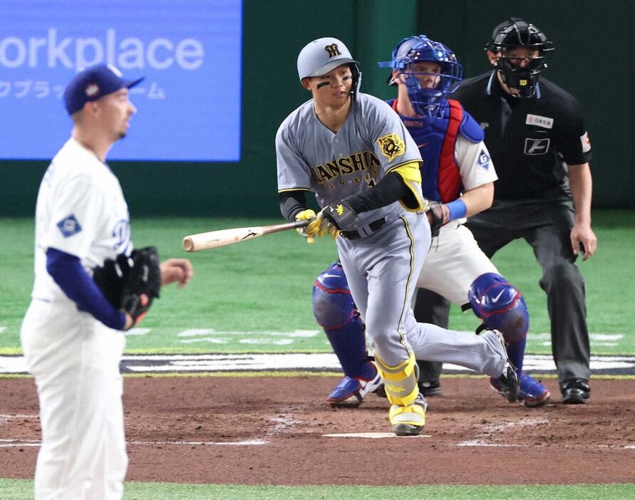 前日15日カブス戦の初回に放った遊ゴロで計測した115.7マイル(約186.2キロ)も両チームで最速だった猛虎の新4番。4回無死で回ってきた第2打席では前を打つ佐藤輝の3ランに続き、スネルの154キロ直球を完璧にはじき返して左翼線二塁打。2試合連続で安打を放ち「すごく楽しかった」。結果と衝撃を残した実り多き2試合を振り返った。