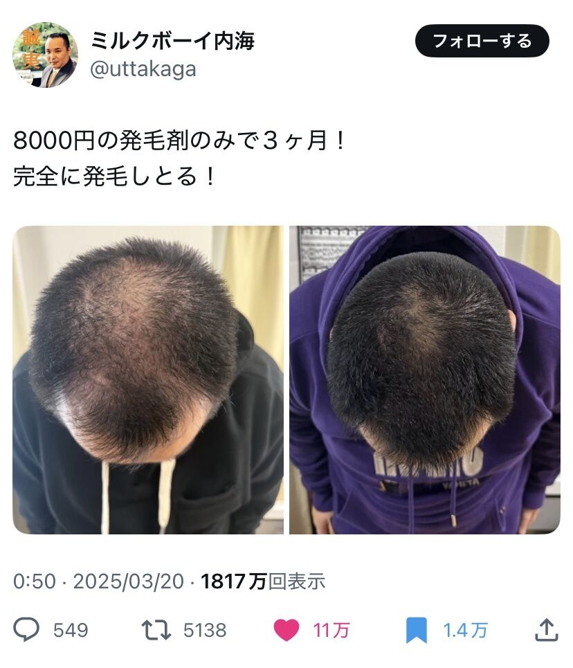 完全に発毛しとる! pic.twitter.com/WlqHY1xRZe— ミルクボーイ内海 (@uttakaga) March 19, 2025