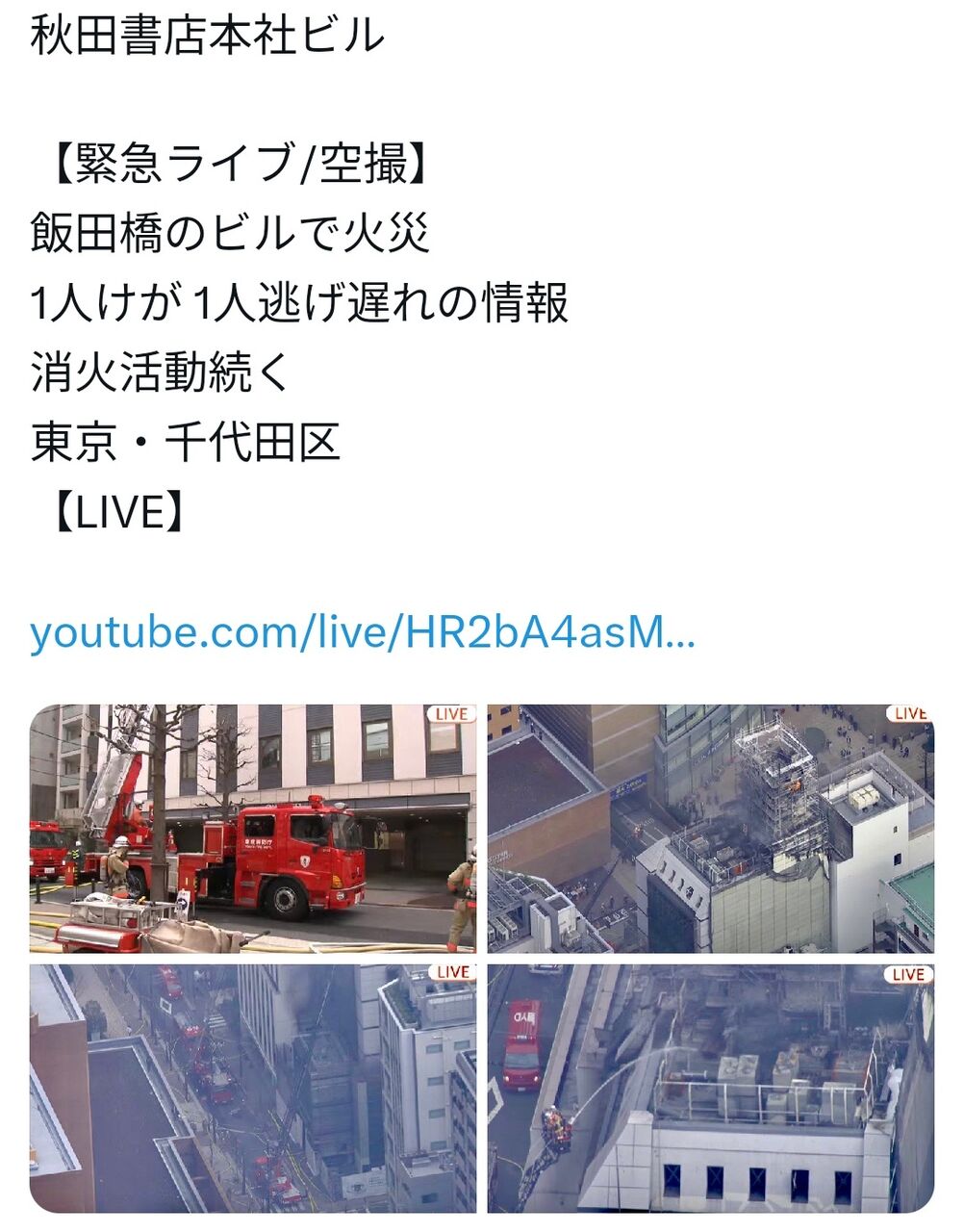 【速報】東京 飯田橋 建物屋上から火が出ていると通報