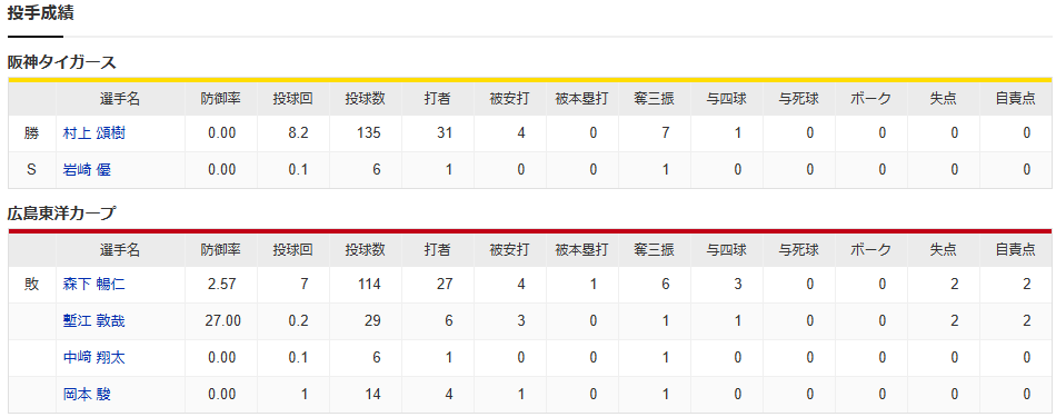 カープ森下がサトテルに痛恨被弾。塹江0.2回2失点炎上。ドラ3岡本プロ初登板無失点!開幕戦は4安打完封負け【広島0-4阪神/試合結果】