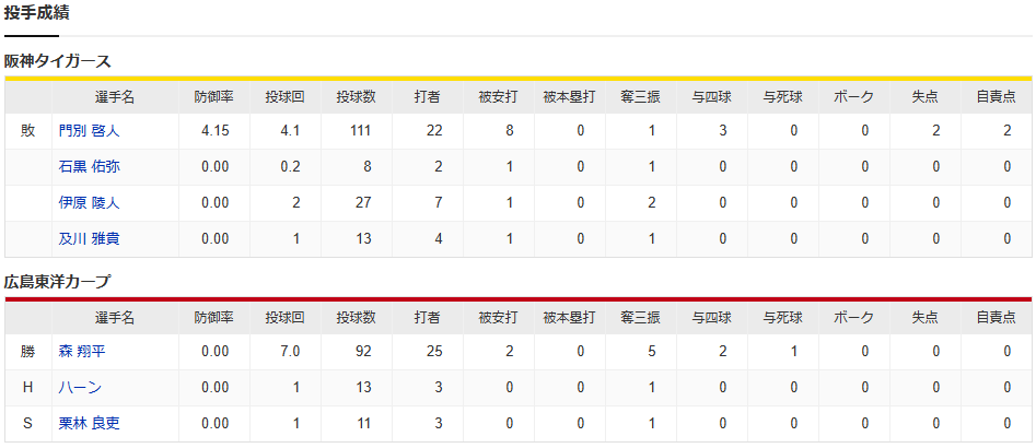 カープ森7回0封!ファビモン初ヒット!菊池先制!田村タイムリー!ハーン火消し!栗林締めで今季初勝利は完封リレー!【広島2-0阪神/試合結果】