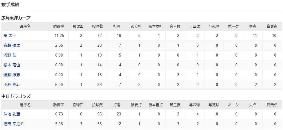 カープ高太一2回11失点乱調。斉藤2回0封!奨成&前川ヒットも小林1回2失点で13失点大敗【広島0-13中日/2軍試合結果】