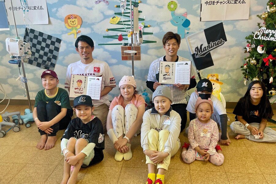 プロ野球・ロッテの中村奨吾内野手が21日、楽天の今江敏晃監督と千葉市内の千葉県こども病院を訪問した。