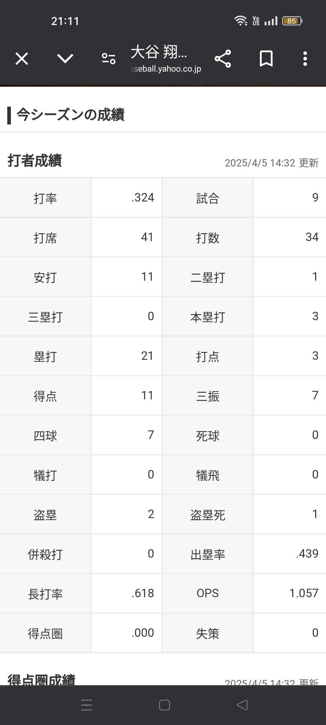 大谷翔平「打率.324(34-11)3本3打点 OPS1.057 盗塁2 盗塁死1」←こいつについての率直な感想www