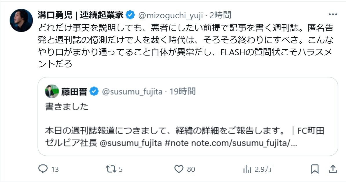 溝口氏は、J1首位に立ったFC町田ゼルビアの藤田晋社長(51)が一部で報じられた黒田剛監督(54)のパワハラ疑惑に対して超長文で反論したX投稿を引用。「どれだけ事実を説明しても、悪者にしたい前提で記事を書く週刊誌」と書き出し、「匿名告発と週刊誌の憶測だけで人を裁く時代は、そろそろ終わりにすべき。こんなやり口がまかり通ってること自体が異常」などとつづった。