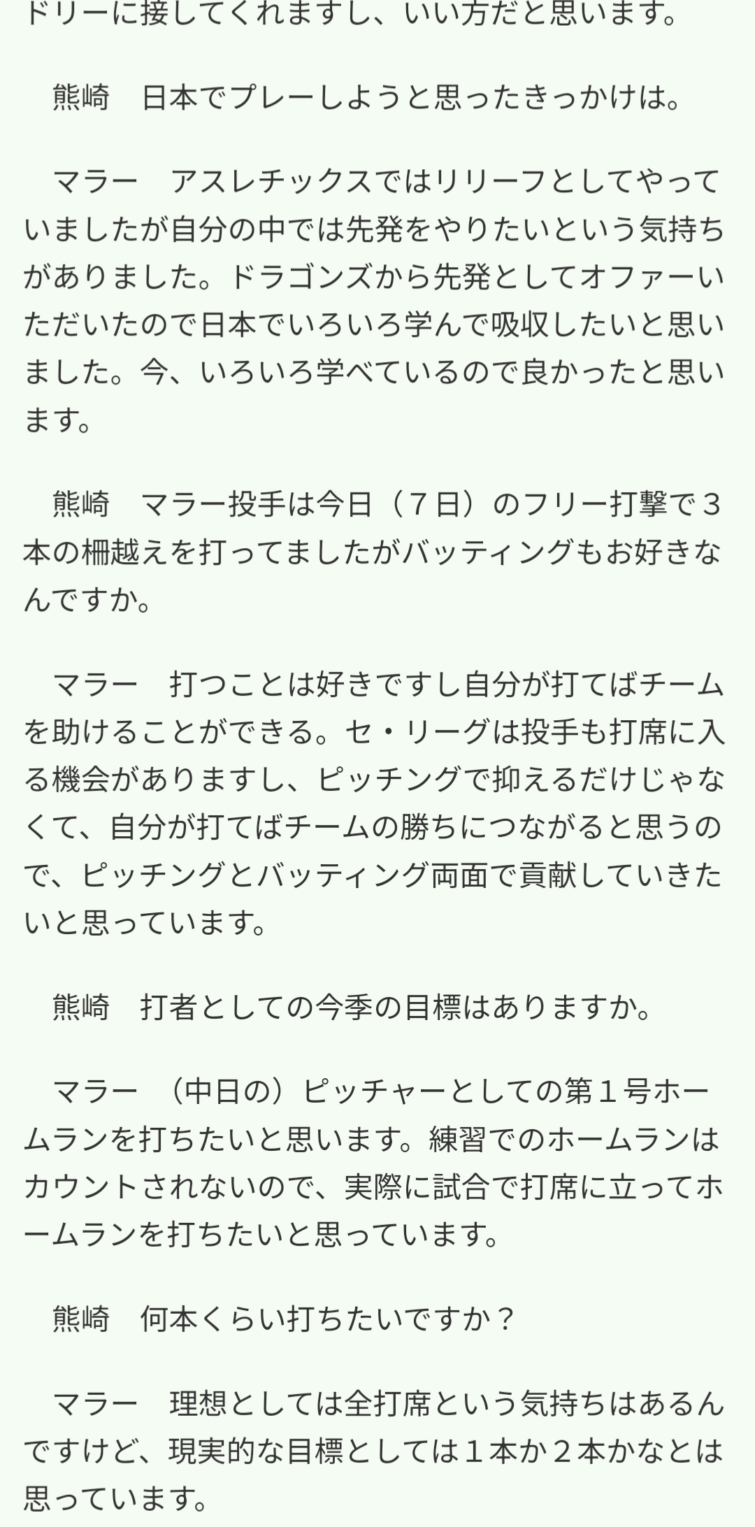 中日マラー「自分が打てばチームの勝ちにつながると思うので、バッティングでも貢献したい」