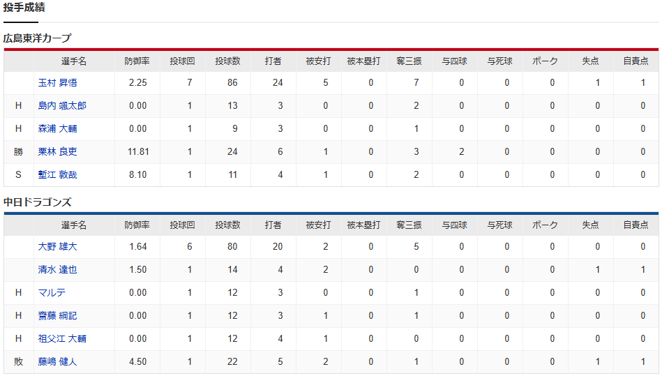 カープ野間決勝2塁打!羽月転びながら生還!玉村7回7K1失点!菊池同点打!バンド11試合ぶり2得点!栗林1勝目!塹江プロ初セーブ締めで延長11回逆転勝利!【広島2-1中日/試合結果】