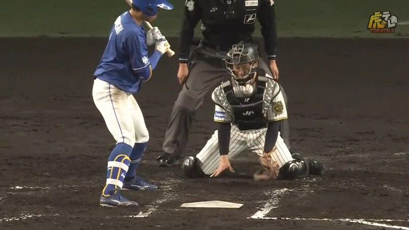 【阪神対中日1回戦】阪神・村上のワンバウンド投球が、捕手坂本の防具とユニホームの間に入り込む 村上の「暴投」扱いで走者進塁