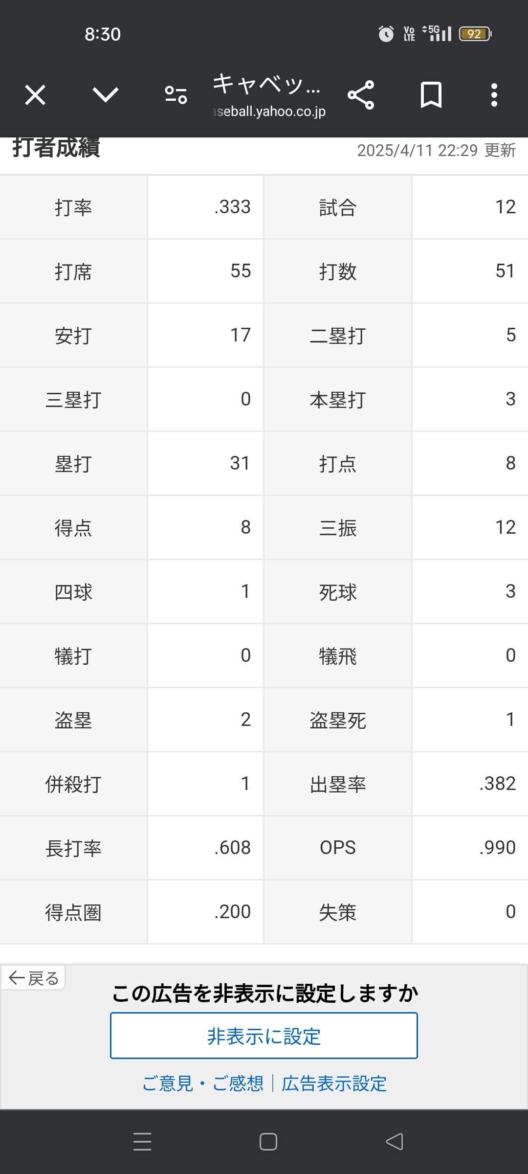 キャベッジ「打率.333(51-17)3本8打点 OPS.990」←これについての率直な感想wwww