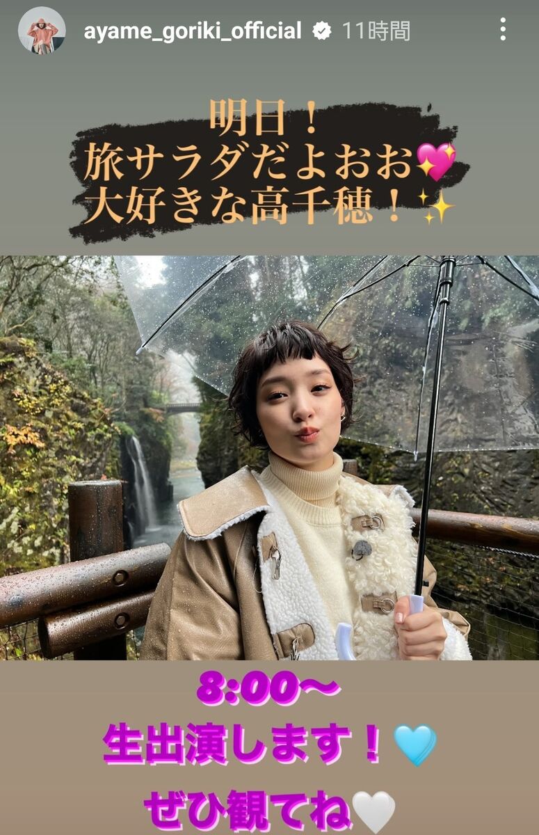 この日は、剛力が観光大使を務める宮崎県高千穂町を訪問する様子を放送。神々が降臨したパワースポットなどを紹介した。剛力は放送前日にインスタグラムのストーリーズにオフショットを掲載し「旅サラダだよおお。大好きな高千穂!生出演します!ぜひ観てね」と呼びかけていた。