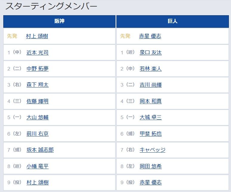 【阪神対巨人4回戦】2(中) 若林 楽人 7(右) キャベッジ 8(左) 岡田 悠希