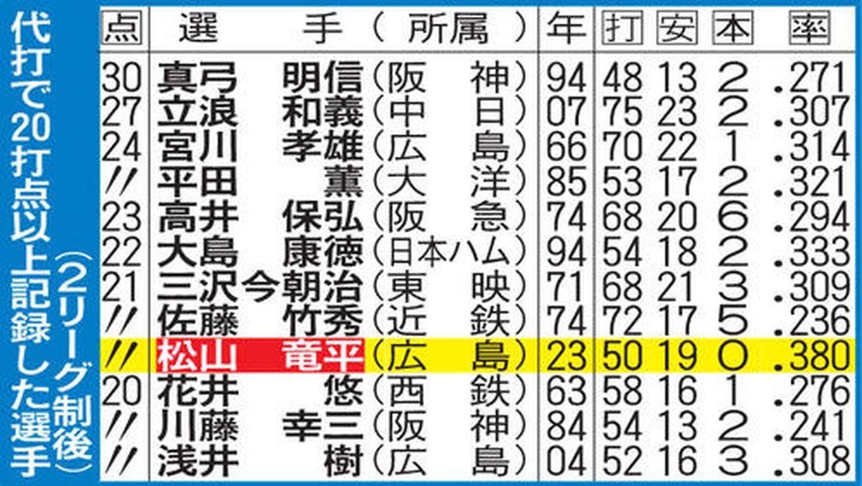 ベテラン松山が代打の切り札として活躍した。今季は先発で出場した24試合が90打数16安打、6打点、打率1割7分8厘に対し、55度起用された代打では50打数19安打、21打点の打率3割8分。安打と打点は先発よりも代打の方が多かった。今季の代打安打は川端(ヤクルト)の20本に次いで2位だったが、打点は両リーグ最多。2リーグ制後、代打の打点は94年真弓(阪神)の30打点が最も多く、21打点は7位タイ。20打点以上は12人目となり、代打本塁打なしで20打点以上は松山だけだ。