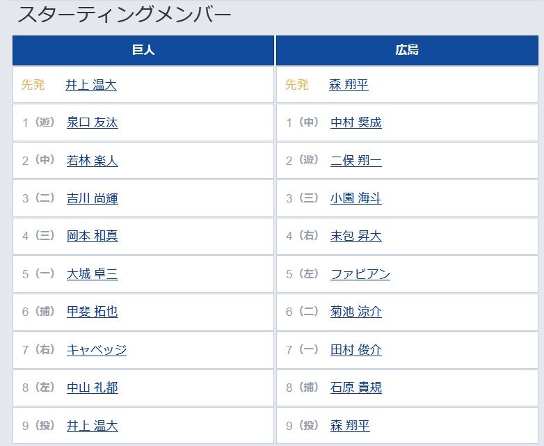【巨人対広島4回戦】7(右) キャベッジ 8(左) 中山 礼都