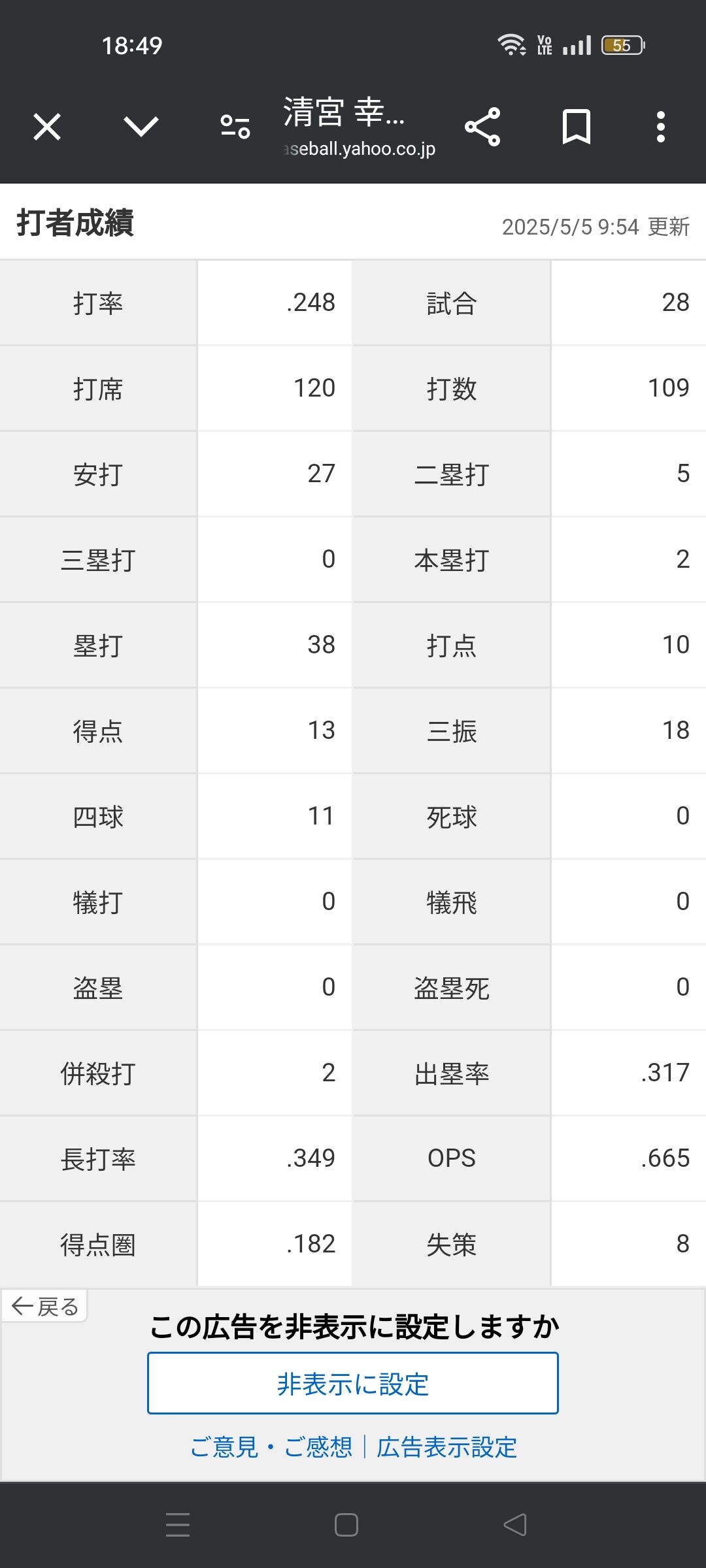 清宮幸太郎「打率.248(109-27)2本10打点 OPS.665 失策8」←これについての率直な感想