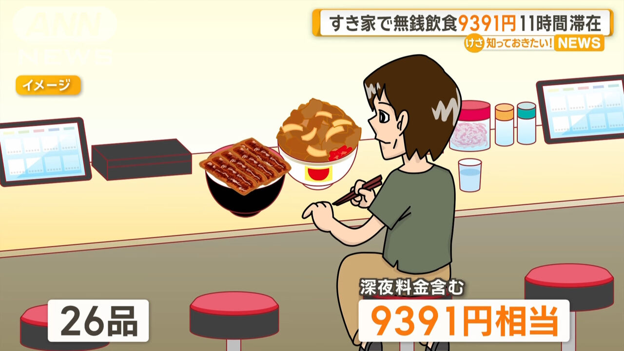 男は先月4日から5日にかけて、栃木県さくら市の「すき家4号さくら店」で支払う意思がないのにキング牛丼やうな丼など26点を注文し、深夜料金を含む9391円相当を無銭飲食した疑いが持たれています。