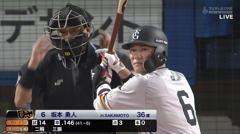 坂本勇人 .143(42-6) 0本 3打点 9三振 1四球 0盗塁 3併殺打 出塁率.158 長打率.190 OPS.346