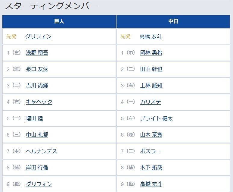 【巨人対中日7回戦】6(三) 中山 礼都 8(捕) 岸田 行倫