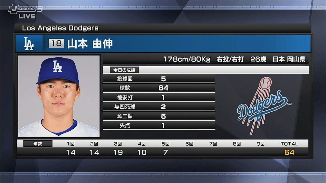 ドジャース・山本由伸、5回まで64球1失点の好投!勝ち投手の権利!