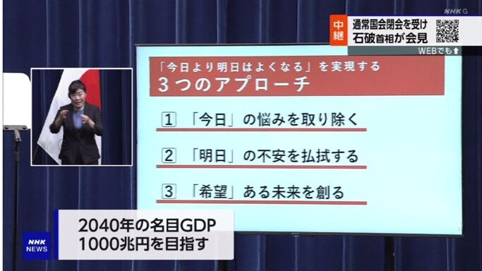 石破総理「2040年に名目GDP1000兆円超え、平均所得5割以上増を実現」