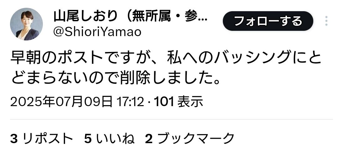 — 山尾しおり(無所属・参院選東京選挙区) (@ShioriYamao) July 9, 2025