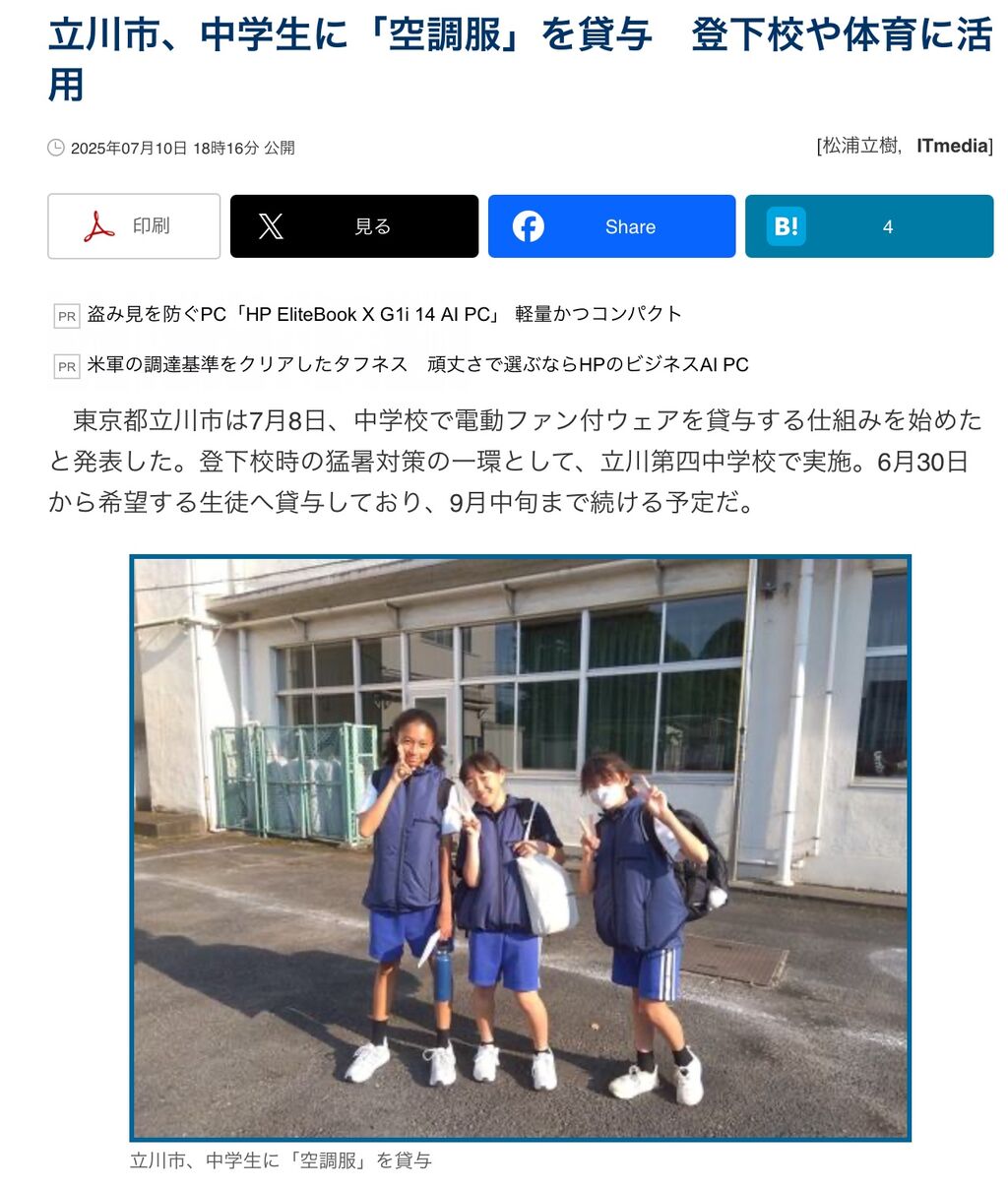 東京都立川市は7月8日、中学校で電動ファン付ウェアを貸与する仕組みを始めたと発表した。登下校時の猛暑対策の一環として、立川第四中学校で実施。6月30日から希望する生徒へ貸与しており、9月中旬まで続ける予定だ。