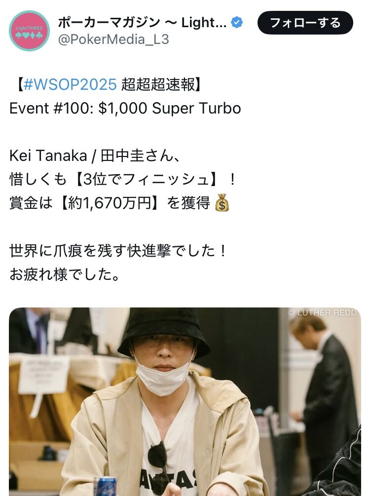【朗報】俳優の田中圭さん、ポーカーの世界的大会で世界3位にwwwww