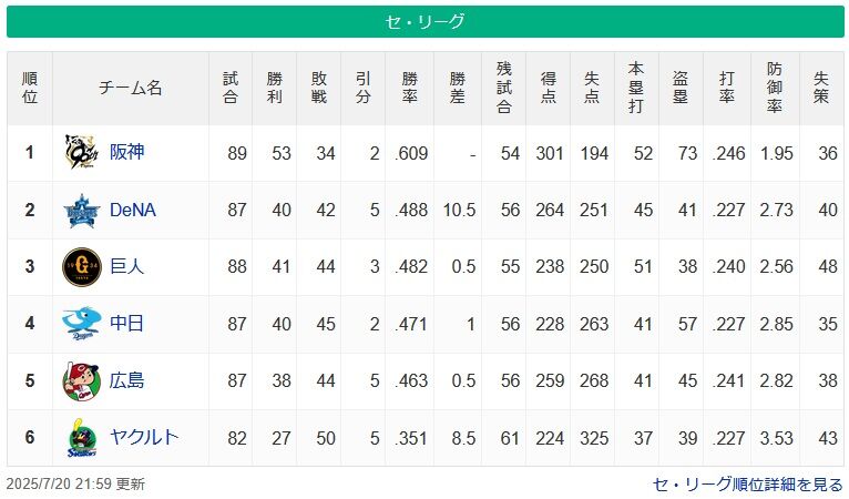 1位阪神2位DeNA10.5差wwwwwwwwwwwwwww