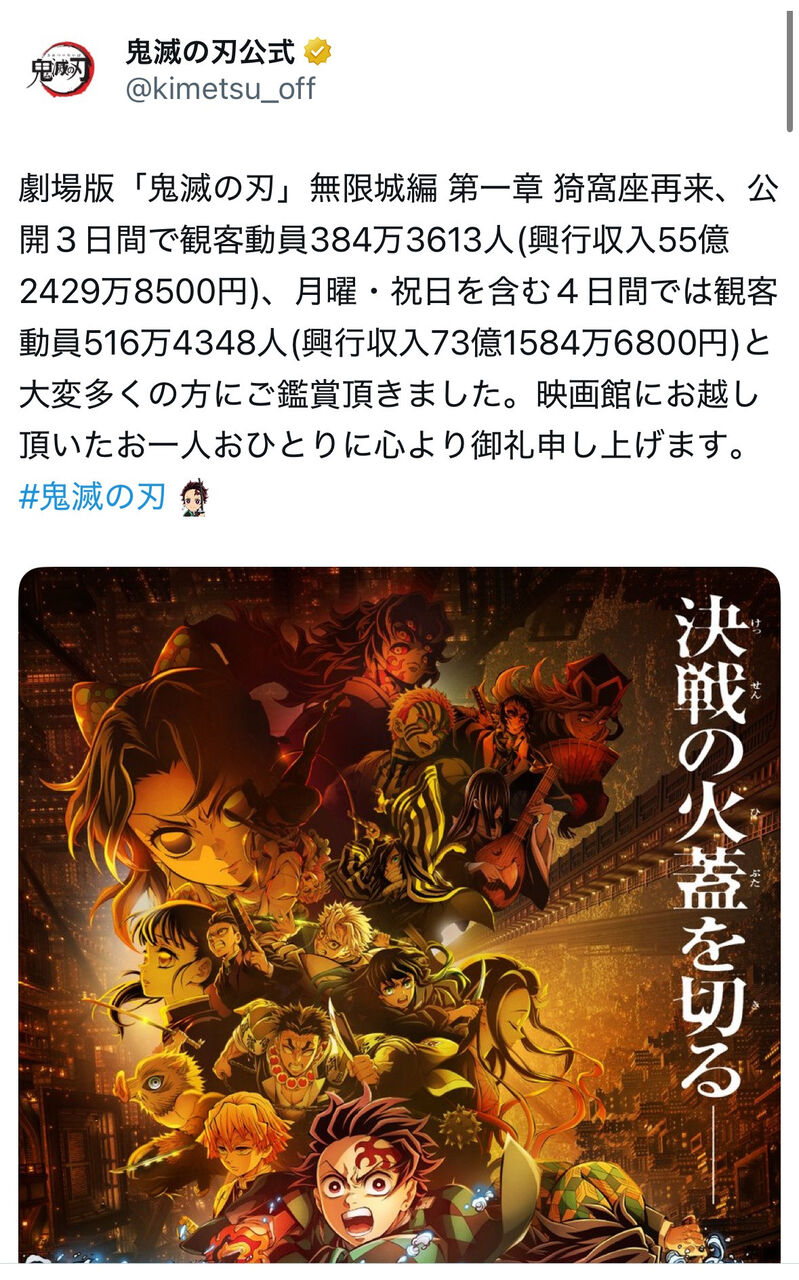 鬼滅の刃、公開4日間で興収73億円