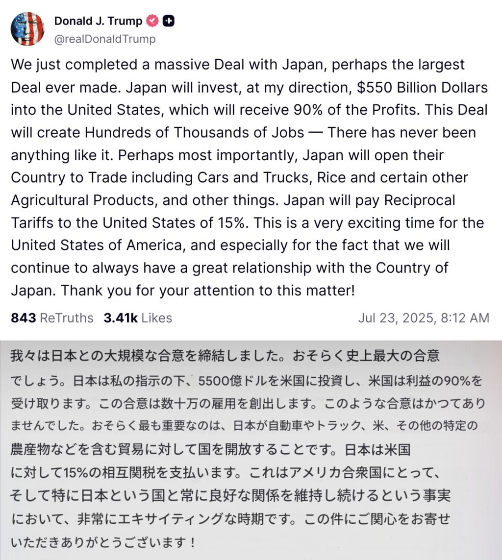 トランプ「日本は関税15%とアメリカに5500億ドルの投資」