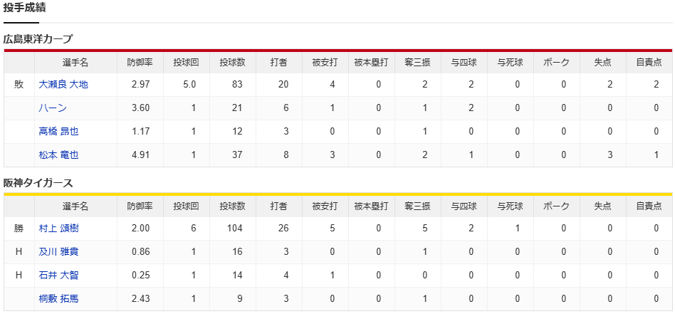 カープ〝底なし沼〟阪神に10連敗。2戦連続完封負けで7連敗。大瀬良に援護なし【広島0-5阪神/試合結果】