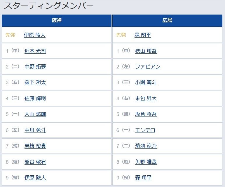 【阪神対広島18回戦】6(左) 中川 勇 7(捕) 榮枝 裕貴 8(遊) 熊谷 敬宥