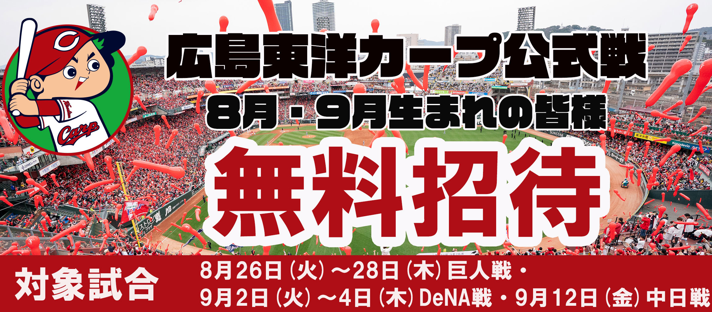 暑い日が続いていますが、マツダ スタジアムも負けないくらい熱く盛り上げていただきたいため、この度Carp IDにご登録いただいている8・9月生まれの皆様を無料でマツダ スタジアムにご招待いたします!