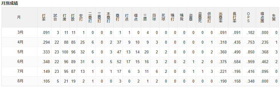 広島ファビアン『7月打率.149』『8月打率.105』←ちょっと夏バテ