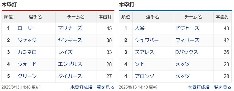 【朗報】ローリー45本 大谷43本 シュワーバー42本 ジャッジ38本