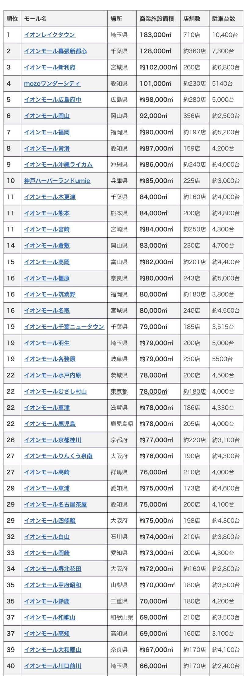 オマイらの街のどデカいイオンモール、TOP40にも入ってなかった😭
