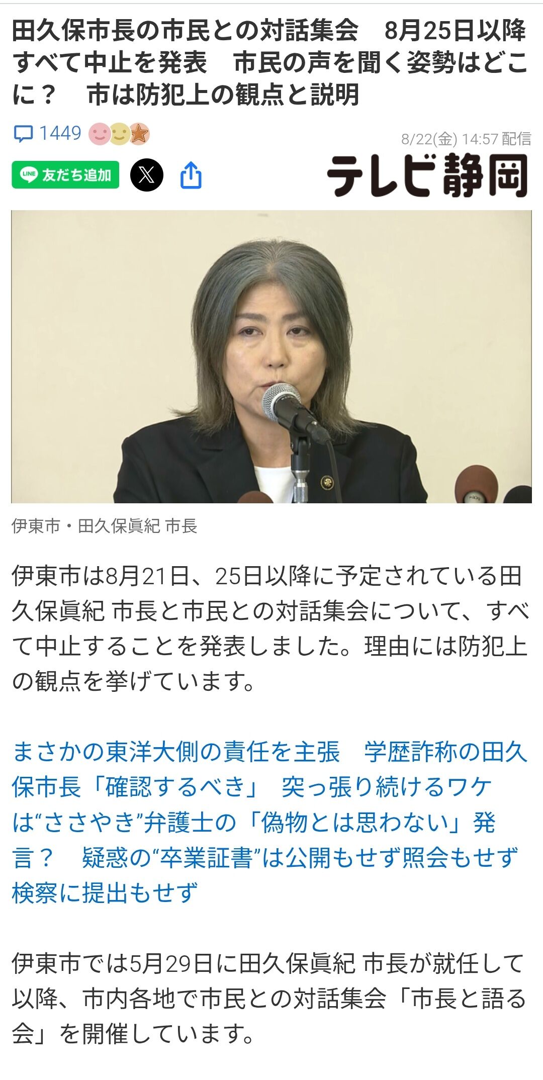 伊東市は8月21日、25日以降に予定されている田久保眞紀 市長と市民との対話集会について、すべて中止することを発表しました。理由には防犯上の観点を挙げています。