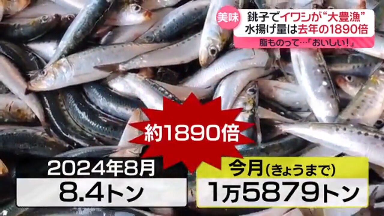 去年の8月、8.4トンの水揚げだった銚子のイワシ。ところが今月の水揚げ量は約1万5800トン。その差はなんと、約1890倍です。