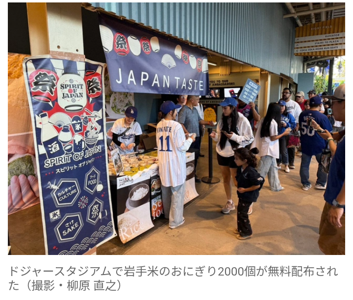 岩手県が10日(日本時間11日)、ドジャースタジアムでのロッキーズ戦前に食のPR活動の一環で岩手米のおにぎり2000個を無料配布した。