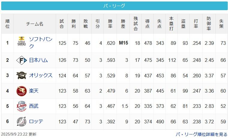 ソフバン⇔日ハム3ゲーム差(残り17試合)←これ