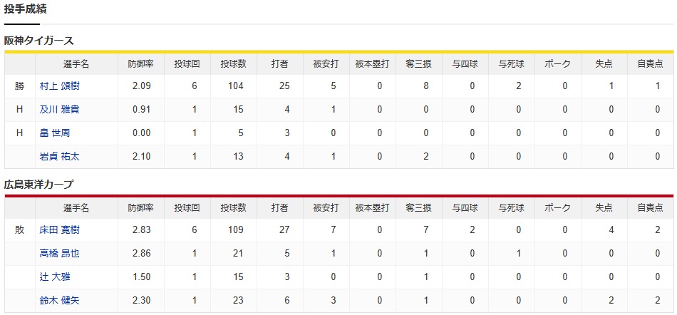 ※広島が2年連続で5割未満確定 佐藤輝を欠く阪神に完敗 床田が6回4失点で11敗目