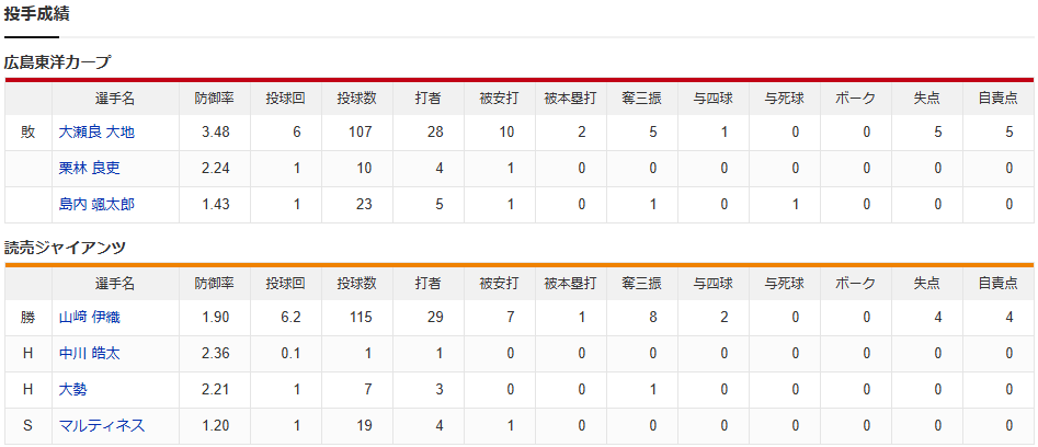 カープ坂倉2点先制打!ファビ17号2ラン!小園マルチ!大瀬良2被弾5失点。投手山﨑に3打点許し3連敗【広島4-5巨人/試合結果】