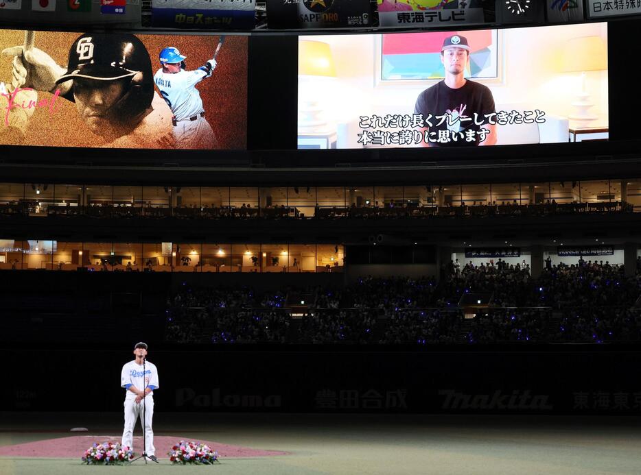 引退セレモニーでは、パドレス・ダルビッシュからのビデオメッセージが紹介されるとスタンドがどよめいた。中田は「ダルさんからメッセージがあると思ってなかったので。現役時代、一番お世話になったといっても過言ではないので。ダルさんにはいろんな面で面倒を見てもらいました」と感謝の思いを打ち明けた。