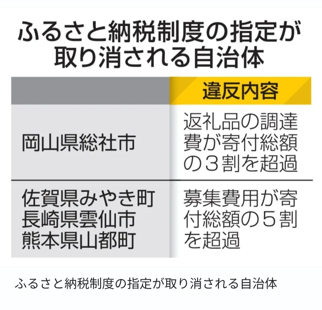 基準を守らない自治体の除外ルールを明確にした2019年6月以降、一度に除外される自治体数としては最多。除外は6~9例目で、寄付額が拡大し、自治体間の競争が激化する中、総務省は違反を許さない姿勢を鮮明にしている。