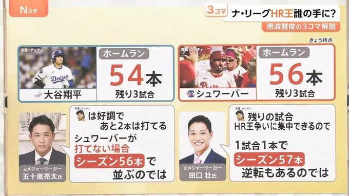また同じく、元メジャーリーガー・田口壮氏は、「大谷選手は残りの試合、HR王争いに集中できるので、1試合1本で、シーズン57本の逆転もあるのでは」とみています。