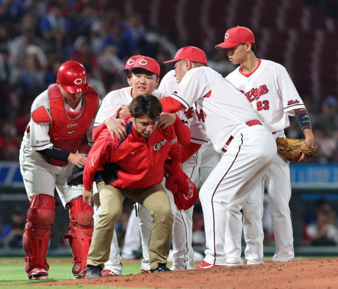 広島・高が打球直撃のアクシデントで緊急降板 自力歩行できずおんぶされてベンチ裏へ