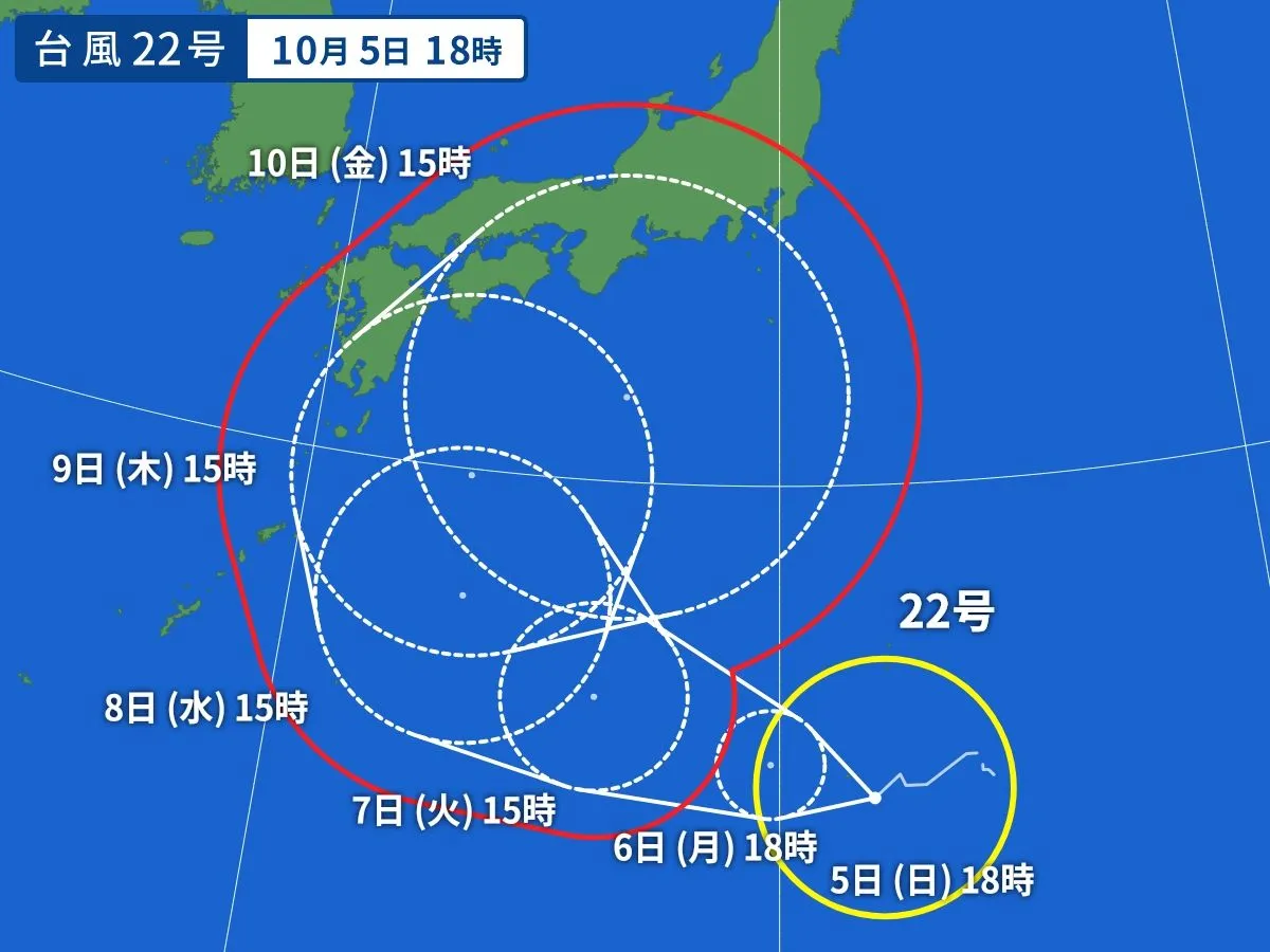 台風22号は、5日(日)午後6時現在、父島の南約300キロにあって、ゆっくりと西南西へ進んでいます。