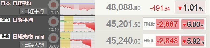 日経平均先物45200円(日経平均金曜終値比-2880円)